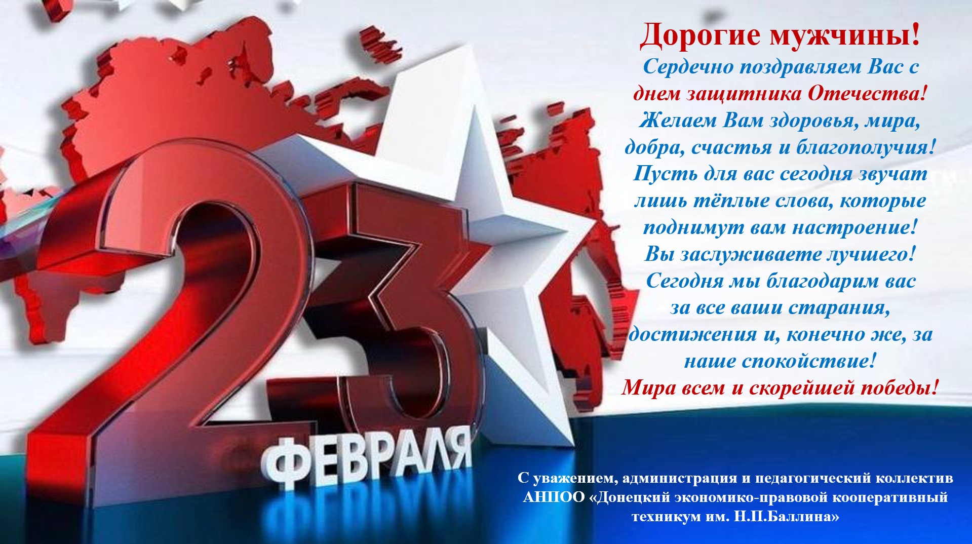 В преддверии Дня защитника Отечества студенты АНПОО "ДЭПКТ имени Н.П.Баллина" поздравляют всех юношей и мужчин с этим замечательным праздником! Ваша сила, мужество и надёжная защита бесценна! Наши студенты желают вам мирного и чистого неба над головой, спокойствия в душе и теплоты семейного очага, и посвящают вам эти праздничные плакаты.
